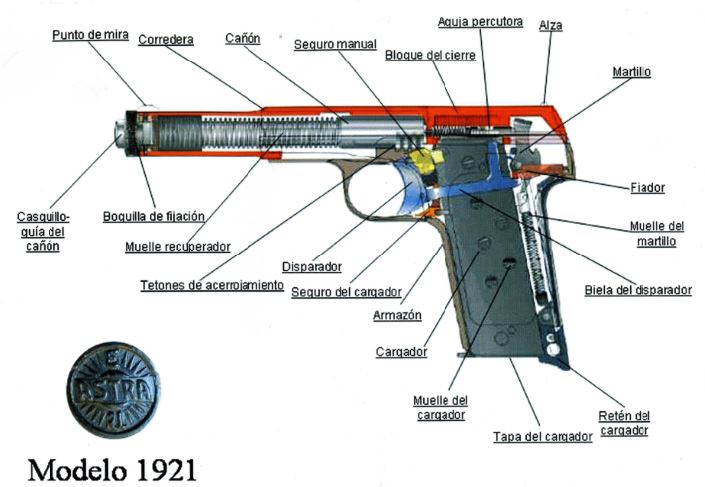 Conviene recordar que la Modelo 1921 no disponía de ninguna palanca de retenida manual de la corredera, sólo pasaba de forma automática cuando la teja el cargador, al agotarse éste, subía una pieza que la fijaba. Para liberarla se echaba hacia atrás manualmente la corredera, tras sustituir el cargador vacío por otro nuevo.