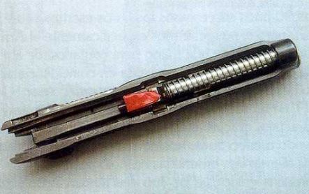 Como medida de seguridad previa se extrae el cargador para, a continuación, tirar de la corredera hacia atrás y comprobar si hay un cartucho en la recamara del cañón. Retraer la corredera, hasta hacer coincidir los rebajes de la misma con el existente en el armazón, girar la palanca de desarme un cuarto de vuelta, en sentido horario, hacia abajo.