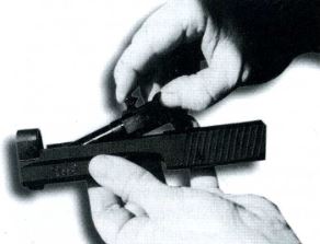 Como medida de seguridad previa, se extrae el cargador comprobándose si hay un cartucho en la recámara. Acto seguido se tira hacia atrás de la corredera hasta el tope y, presionando hacia arriba el retén de aquélla, se le mantiene en posición abierta.