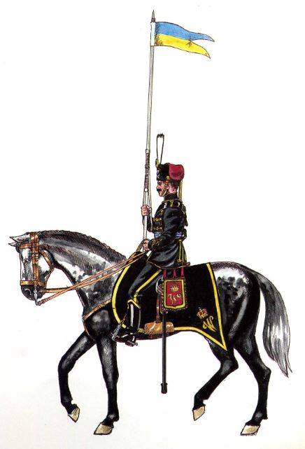 Finalmente hay que señalar que la banderola de las lanzas es asimismo en los colores nacionales azul y amarillo, aunque los suboficiales armados de lanza tenían banderola amarilla con un círculo rojo y en su centro el Caballo Blanco.