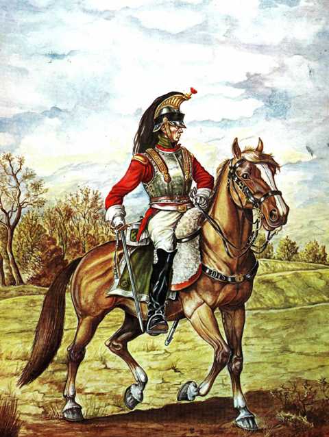 Por el general en jefe del Primer Ejército de Cataluña, Don Enrique O’Donell, conde de La Bisbal, y estando en la villa de Reus, se crea el Cuerpo de Coraceros mostrado en la presente lámina. Fue el 24 de mayo de 1810 y se formó en base de la compañía del Regimiento de Húsares de Granada. Dice el autorizado conde de Clonard en su “Historia Orgánica de la Caballería” que para su formación se aprovechó el armamento tomado a los coraceros franceses en la batalla de Mollet. Aunque no precisa el vestuario, cabe suponer que los uniformes fueran también franceses visto su estilo y porte. Nada tiene de particular dado que por ese tiempo en España faltaban tanto armas como uniformes. Existía el precedente de aquellos insignes guerrilleros que llegaron a ser generales del Ejército regular como Don Francisco Longa y Don Juan Martín El Empecinado que formaron sus Húsares de Iberia y de Guadalajara con uniformes nuevos tomados de los convoyes franceses.