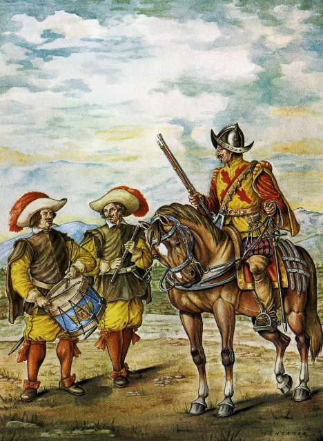 Volviendo a los músicos, conviene aclarar que en el año 1638 hubo una ordenanza de S.M. en la que decía, entre otras cosas, que cada uno de los Tercios creados en España constasen de 12 compañías, y cada una de 250 infantes, incluida la primera plana compuesta de capitán con paje, alférez abanderado, sargento, “dos tambores y un pífano” furriel, barbero y capellán. .