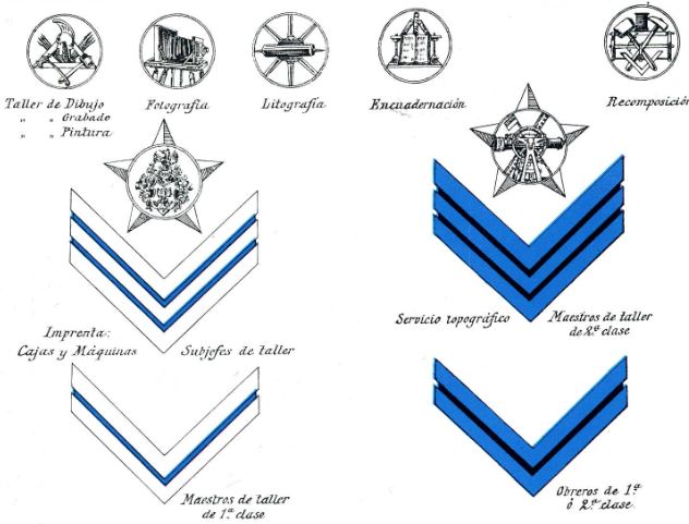 Naturalmente, con todos estos uniformes se lucía una serie de divisas correspondientes al empleo del distinto personal, siendo para los jefes de Taller una, dos o tres serretas de plata de 6 mm. de ancho en las bocamangas y encima de los galones una, dos o tres estrellas de plata de seis puntas, separadas 20 mm. Los maestros de Taller lucían los galones de ; sargento 1º, en plata, formando ángulos, y los obreros de cabo primero para los de 1ª clase y los de cabo segundo para los de 2, ambos dispuestos de igual forma que los maestros de taller y en azul.