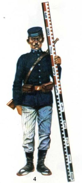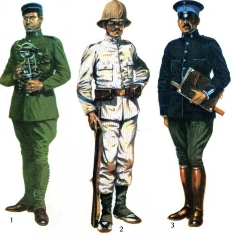 El de campaña, igual al descrito, se añadían un cinturón de cuero, color avellana, con palín negro para el machete, cartucheras, mochila morral y revólver reglamentario. Estos uniformes se completaban con un sombrero de fieltro gris de ala ancha con escarapela de los colores nacionales con presilla azul celeste y estrella blanca. Para invierno tenía un capote de los llamados de monte con cuello vuelto azul celeste y cerrado por cinco botones y una correa bandolera avellana. Los obreros de 2ª auxiliares topógrafos (soldados), usaban en lugar de revólver el mosquetón modelo 1871.