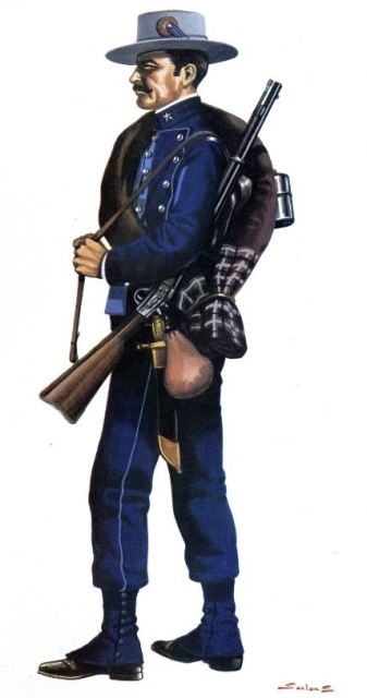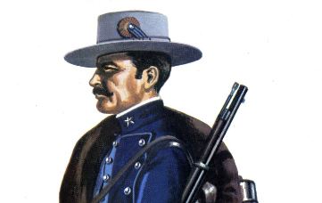 El primero, de acuerdo con el reglamento de 1886, constaba de gorra de plato azul con franja celeste, estrella de cinco puntas blanca en el centro y las iniciales del empleo. Chaquetón de paño azul tina con vivos azul celeste, solapas y bolsillos a los costados, con botones de metal blanco. Debajo de esta prenda, se vestía un chaleco del mismo paño con cuello alto cerrado con corbatín y nueve botones. El pantalón de igual paño y color que las anteriores con un vivo azul celeste de 1 cm. Borceguíes de piel de becerro negra, sobre los que en los días lluviosos, recogiendo el pantalón, se colocaban polainas de paño azul con siete botones. Los días de frío un capote azul. Los guantes eran blancos.
