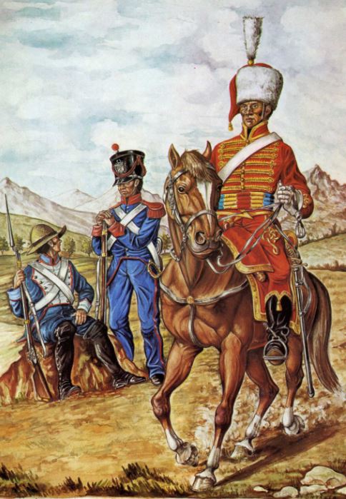 De los uniformes presentes poco puede decirse dadas las circunstancias en las que se desarrollaron los primeros tiempos de la revolución. Todo era improvisado y lo de menos era la uniformidad. Lo importante era pelear, a ser posible con buenas armas. La regularidad vendría después. No obstante debe decirse que en esos batallones sueltos y futuros regimientos ya se adoptaba el color azul claro para la infantería en diversos modelos de casacas o casaquillas. En cuanto a ese uniforme de cazador montado para la guardia de Bolívar estaba inspirado en los uniformes ingleses por los que el Libertador sentía gran admiración..