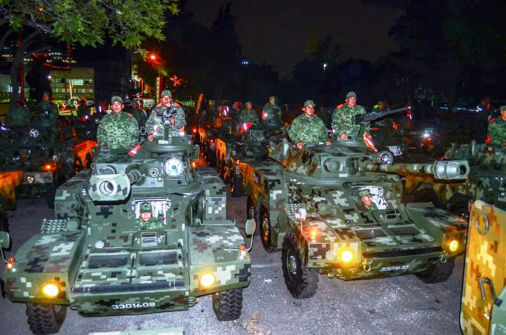 Un año antes, en el último desfile de 16 de septiembre del presidente saliente Enrique Peña Nieto, desfilaron 18.736 integrantes de las Fuerzas Armadas, Policía Federal, Comisión Nacional del Agua y asociaciones de charros; 123 banderas, 30 soldados y marinos honorarios, 10 rescatistas, 20 niñas y niños; 401 vehículos, 177 aeronaves; 53 canes y 269 caballos. (Jorge Alejandro Medellín )