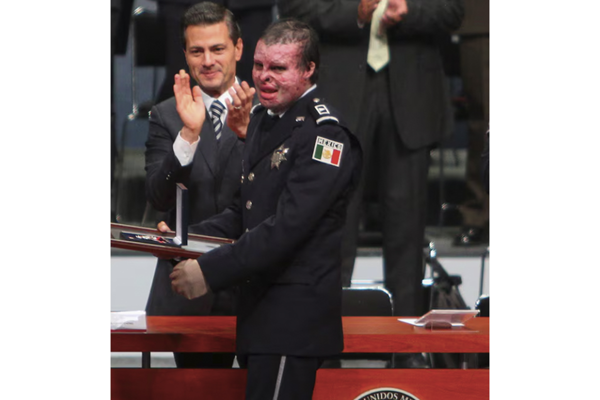 El agente de la Policía Federal Iván Morales Corrales, sobreviviente al derribo del helicóptero y asesinado hace unos días, recibiendo un reconocimiento del entonces presidente de México. (foto: presidencia de México)