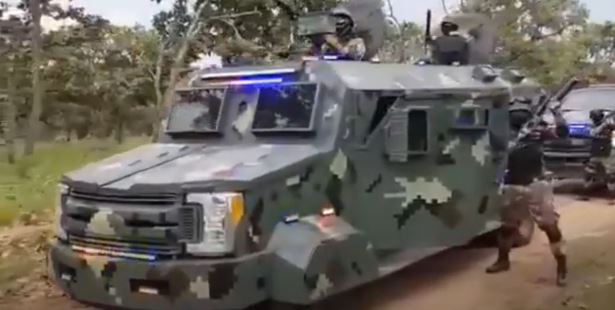Los sicarios del cártel aparecen a un costado de decenas de vehículos pixelados en tonos militares similares a los que usa el Ejército Mexicano. En algunas de las unidades se ven logotipos del CJNG con la leyenda “Fuerzas Especiales Grupo Elite”. Algunos tienen torretas con afustes para el montaje de ametralladoras calibre 0.50 y 7.62 milímetros.