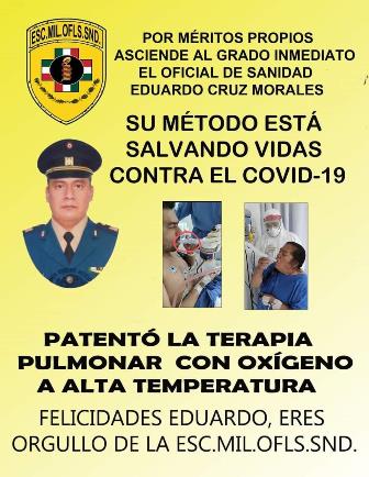 El Capitán Segundo se ganó el ascenso y el reconocimiento de sus hermanos de armas y servicios, porque puso en práctica un tratamiento que consiste en aplicar a enfermos de COVID-19 no intubados, terapias con oxígeno calentado hasta cerca de los 50 grados centígrados en la zona de la laringofaringe y en la traquea, para detener al virus y disminuir significativamente los daños que causa y su expansión.