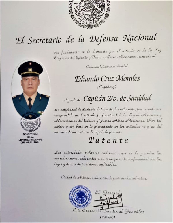 El ascenso al ahora Capitán Segundo de Sanidad Militar Eduardo Cruz Morales es el tema central en las redes sociales entre militares activos y retirados en el Ejército y Fuerza Aérea Mexicanos, en donde la pandemia del coronavirus ha causado la muerte de al menos 238 elementos entre las fuerzas militares de tierra y aire.