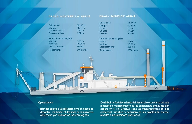 Datos de la SEMAR indican que La draga “Montebello” ADR-18 tiene una eslora (largo) de 58.00 metros, manlga(ancho) de 12.44 metros, desplazamiento (peso) de 485 toneladas, rendimiento 3100 m3/hr. La “Morelos” ADR-19 tiene con una eslora (largo)de 61.20 metros, manga (ancho) de 10.50 metros, desplazamiento (peso) de 535 toneladas, rendimiento 3000 m3/hr; características que servirán para el dragado en los azolves generados por fenómenos meteorológicos, además de contribuir al fortalecimiento del desarrollo económico del país, mediante el mantenimiento de las condiciones de navegación segura en el río Grijalva, para las embarcaciones de tipo comercial, turística y pesquera en los canales de acceso, muelles e instalaciones portuarias.