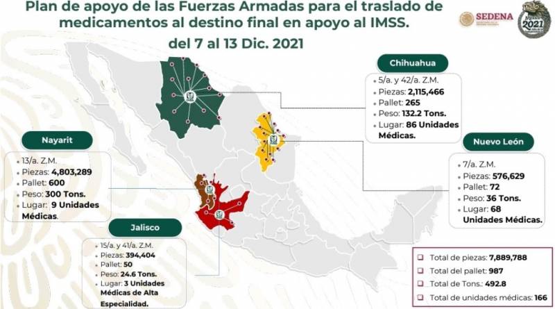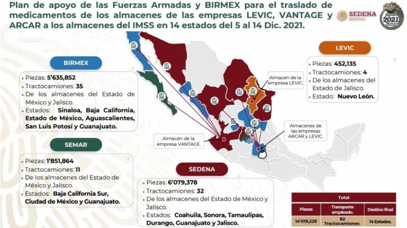 La Armada de México está distribuyendo en este esquema 1.851.864 medicamentos en 11 camiones desde los almacenes del Estado México y Jalisco hacia Baja California Sur, Ciudad de México y Guanajuato. La SEDENA está movilizando 6.079.378 medicinas en 32 camiones que han salido también desde los almacenes del Estado de México y Jalisco con rumbo a los estados de Coahuila, Sonora, Tamaulipas, Durango, Guanajuato y Jalisco.