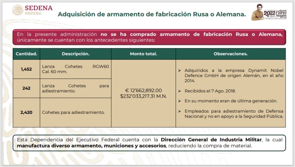 En el caso de los 4.114 lanzacohetes RGW-60, calibre 60 milímetros, la Secretaría de la Defensa Nacional (Sedena) registró su compra en el micrositio de su portal en el que se informa solo de una parte de las compras de material y equipo bélico hechas a empresas extranjeras.