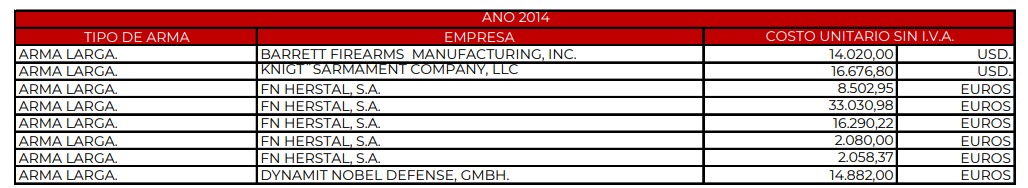 De acuerdo con los datos de la Sedena, en 2014 se compraron lotes de armas largas a cuatro empresas extranjeras: Barret Firearms Manufacturing, Inc; Knigt Sarmament (sic) Company; FN Herstal, S.A. ‑‑cinco lotes de armas a esta empresa‑‑ y Dynamite Nobel Defense, GMBH.