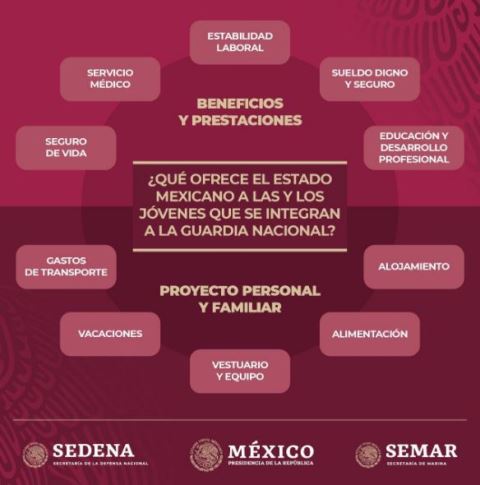 En el video también aparecen infografías con el calendario de reclutamiento y con algunos detalles sobre los beneficios de pertenecer a la corporación. En los mensajes se plantea “¿Qué ofrece el Estado Mexicano a las y los Jóvenes que ase integran (sic) a la Guardia Nacional?”, y se ofrecen diez escenarios como respuestas a la pregunta central: Estabilidad laboral, Sueldo digno y seguro, Educación y desarrollo profesional, Alojamiento, Alimentación, Vestuario y equipo, Vacaciones, Gastos de transporte, Seguro de vida y Servicio Médico.