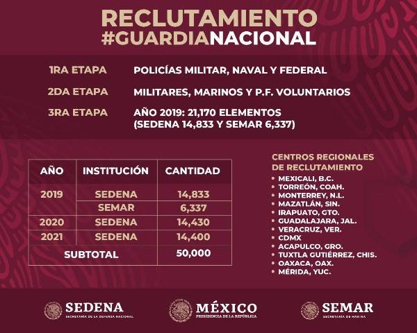 El presidente de México, Andrés Manuel López Obrador (AMLO), anunció oficialmente el inicio de la campaña de reclutamiento para incorporar a los primeros cincuenta mil miembros con los que empezará a operar la Guardia Nacional (GN), corporación con la que el nuevo gobierno quiere luchar contra el crimen organizado y a la delincuencia común.