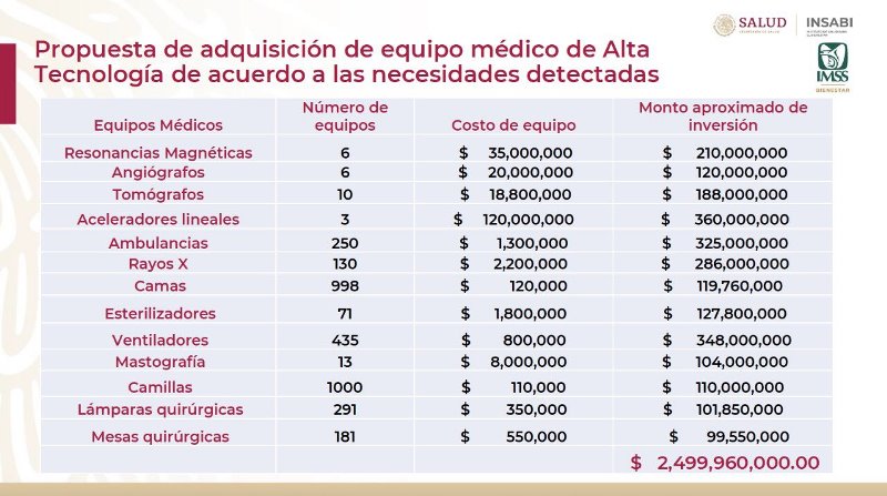 El primero, elaborado por entidades del sector salud (Secretaría de Salud, Instituto Mexicano del Seguro Social-IMSS y el instituto Nacional de Salud para el Bienestar-INSABI, menciona la misma cantidad que se espera obtener y describe los equipos requeridos.