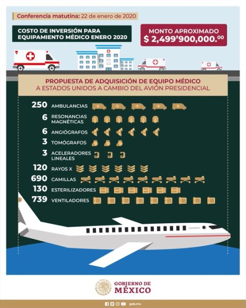 El presidente de México, Andrés Manuel López Obrador, tiene una nueva propuesta para deshacerse del avión presidencial que heredara de sus antecesores, Felipe Calderón y Enrique Peña Nieto,: cambiárselo al presidente de los Estados Unidos, Donald Trump, por insumos de salud y medicina de alta calidad.