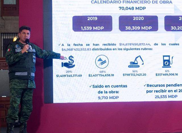 A la fecha ya hemos recibido 14.678 millones de pesos (alrededor de 555,7 millones de euros), de los cuales hemos ejercido casi cinco mil millones de pesos. El militar detalló la manera en que se han ejercido los recursos destinados al AIFA. Casi 30 por ciento corresponde al pago de mano de obra, 50 por ciento aproximadamente a la adquisición de materiales, 16 por ciento lo que corresponde a la renta de maquinaría adicional, seis por ciento de combustibles y uno por ciento de gastos administrativos de seguridad y de higiene debido al coronavirus.
