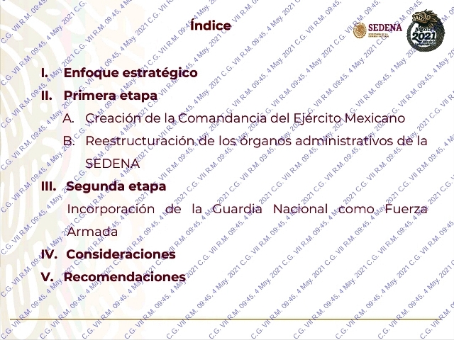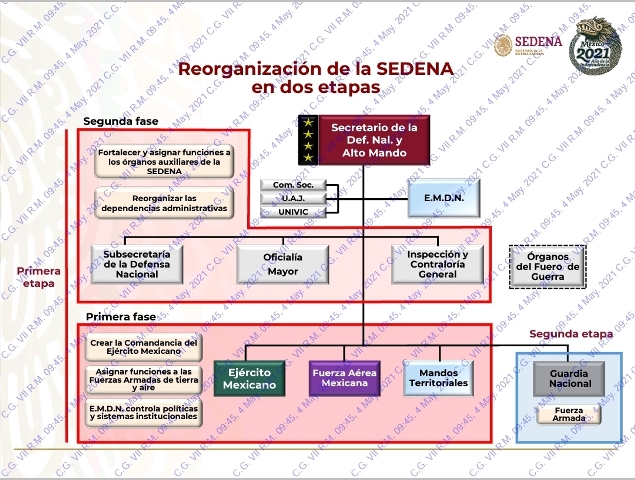 En la segunda etapa se incorporará a la Guardia Nacional “como Fuerza Armada”, recordando que “la Sedena ya ejerce la coordinación operativa” de la corporación. La incorporación se proyecta en dos etapas; la primera, en 2021, contempla “presentar al presidente el proyecto de iniciativa de reforma constitucional, remitir el proyecto a la Cámara de Diputados, cabildeo en el congreso y promulgación de la reforma constitucional”.