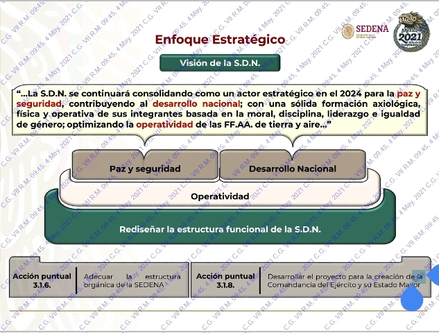 Un documento elaborado por la Defensa Nacional fechado el pasado 3 de mayo, titulado Reorganización de la SEDENA, adelanta una serie de cambios en marcha y por venir que se han planeado en dos fases, destacando varias propuestas que se le harán al presidente Andrés Manuel López Obrador para llevar adelante las modificaciones que permitan colocar a la SEDENA en una nueva realidad que le exige redimensionar y adecuar su estructura, sus funciones, los mecanismos para alcanzar metas y el sustento jurídico para logra los fines deseados.