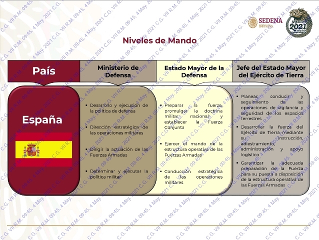 En un apartado denominado Niveles de Mando, el documento de la SEDENA aborda el tema de la creación de un Estado Mayor Conjunto con comparaciones rápidas sobre los casos de estructuras similares en las Fuerzas Armadas de España, Brasil, Colombia, Ecuador, Perú y Venezuela.