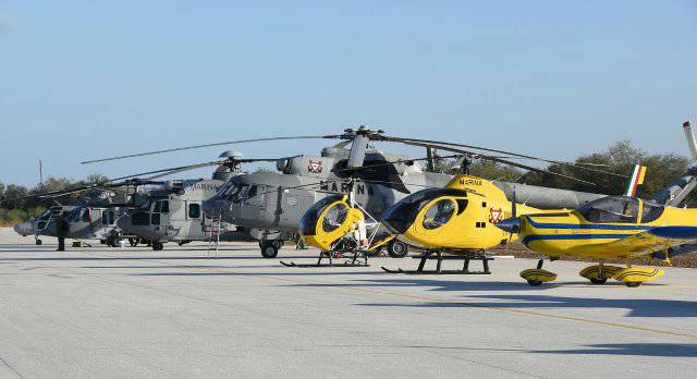 Fotografía: Línea de los diferentes modelos de helicópteros de la SEMAR, el segundo desde la derecha es un Schweizer 333. (foto SEMAR)