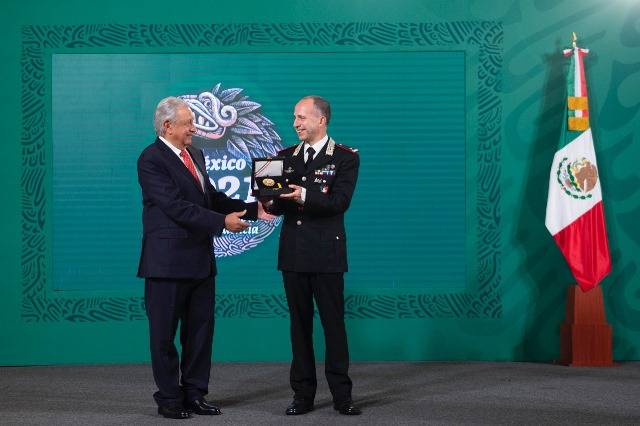 Y también, dijo, por la muy destacada colaboración del general de Brigada, Roberto Riccardi, con distintas autoridades mexicanas que han traído como resultado la restitución de 74 piezas arqueológicas y 584 exvotos desde 2013, siempre en favor de la defensa del patrimonio cultural e histórico de nuestro país.