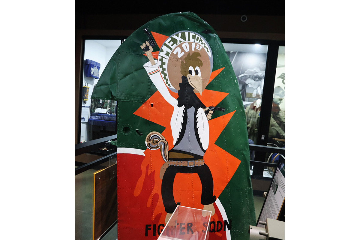 Otro de los recuerdos que podemos ver en la sala del museo de March, es parte del ala de un avión, probablemente japones dado que lleva la insignia del sol naciente, en la que esta pintada la figura del gallo "Pancho (o Panchito) Pistolas", que fue la mascota del Escuadrón 201. Este personaje, fue creado en 1944 por los dibujantes de la filmográfica Walt Disney Company, como un instrumento de propaganda en el marco de la SGM, para poner en valor la alianza entre Estados Unidos y Brasil, que fueron representados en la película de la productora “Los tres caballeros”, y eran el icónico Pato Donald, un loro llamado José Carioca simbolizando a Brasil, y el referido Pancho Pistolas.