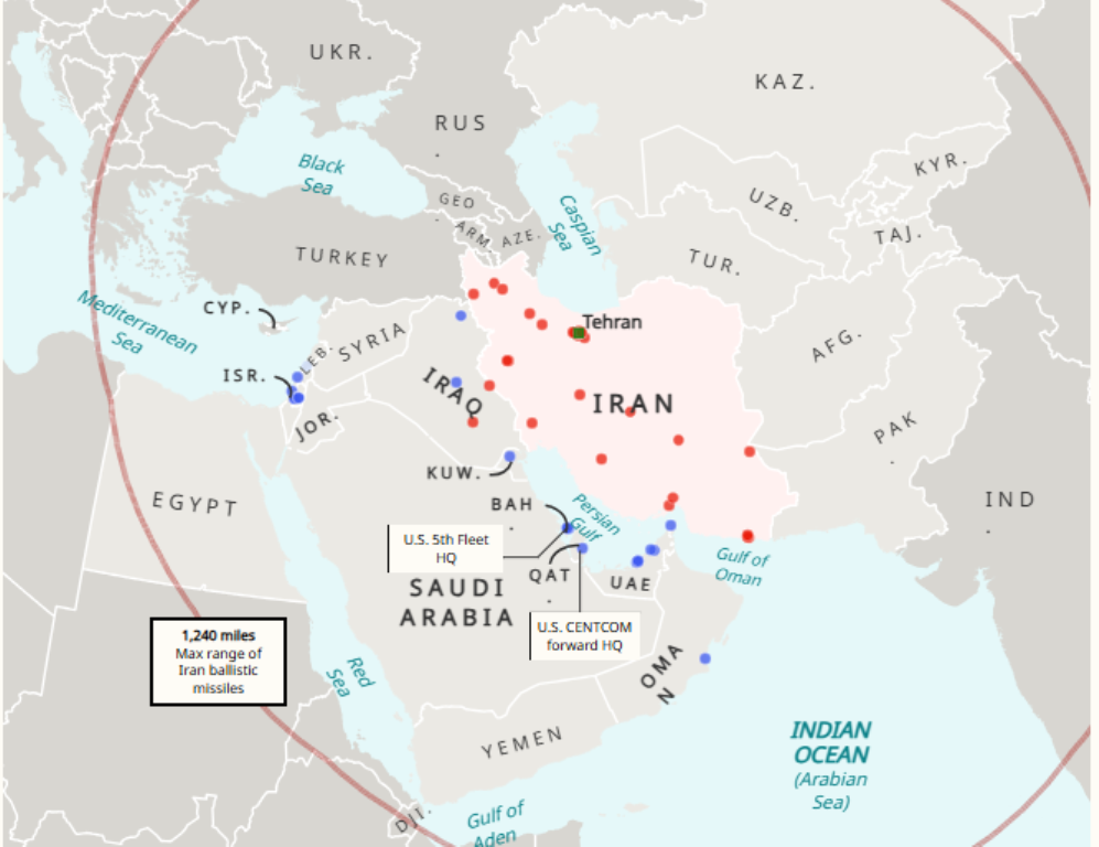Alcance máximo de los misiles balísticos Irán. Fuente: Iran War Live: Europe Ramps Up Middle East Deployments as Ayatollah Demands ‘Trump’s Blood’, Newsweek, 05-03-2026