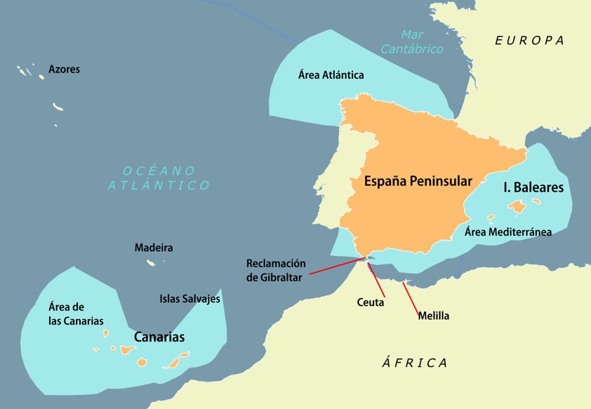 Zona económica exclusiva de España con las reclamaciones más importantes (NACLE vía Wikipedia)