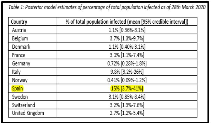 El informe concluye que España lidera con diferencia el ranking de contagios. El número de personas infectadas (muchas de ellas ya curadas e inmunizadas) se puede estimar en un 15% de la población (aproximadamente 7.125.000 personas). Pero además, como todo buen trabajo estadístico, establece un intervalo de probabilidad con un límite inferior del 3,7 % y superior del 41 %. En otras palabras en España, a fecha 28 de marzo, había habido un mínimo de 1.750.000 infecciones y un máximo de 19.475.000.