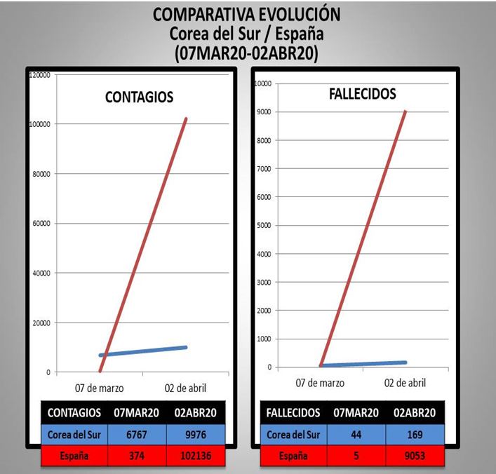 Independientemente de que los datos sean totalmente exactos (dependen de las fuentes que se consulten) podemos afirmar que hace aproximadamente un mes (07MAR20) las cifras de España eran sensiblemente mejores que las de Corea del Sur (374 contagios frente a 6767 y tan solo 5 defunciones frente 44). Hace unos días (02ABR20) el panorama había cambiado ¡Y de qué manera! (102136 contagios y 9053 fallecidos en España frente a 9976 y 169 en Corea del Sur).