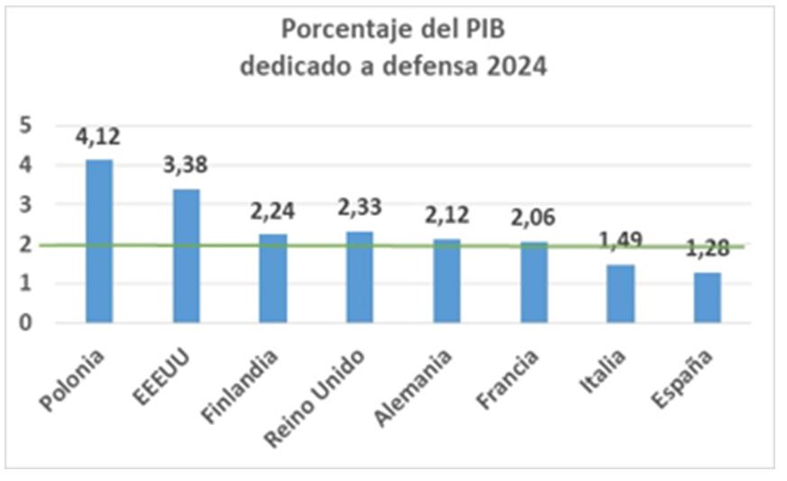 España e Italia se alejan aún más del modelo finlandés, con el 1,28 % y 1,49% del PIB gastado en defensa, están lejos de llegar al citado 2 % establecido por la OTAN, lo que no tienen fácil cumplir porque, debido a sus altos niveles de deuda y déficit, tendrían que disminuir el gasto en otras partidas presupuestarias; algo inimaginable para sus respectivas sociedades. Según Ipsos «sólo el 51% de los españoles y el 43 % de los italianos se muestran a favor de aumentar el presupuesto de defensa, lo que contrasta con los Países Bajos, Francia Reino Unido y Alemania en donde el respaldo se encuentra entre el 71 % y el 65 %».