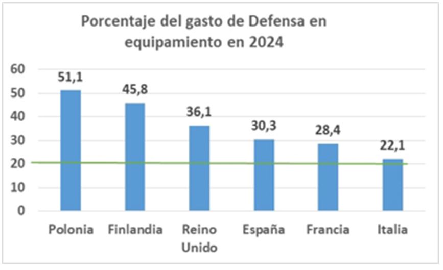 En 2024 Finlandia cumplirá sobradamente las dos condiciones establecidas por la OTAN a los países miembros: dedicar a defensa el 2 % del PIB (Figura 3) y a equipamiento militar el 20 % del gasto de defensa.