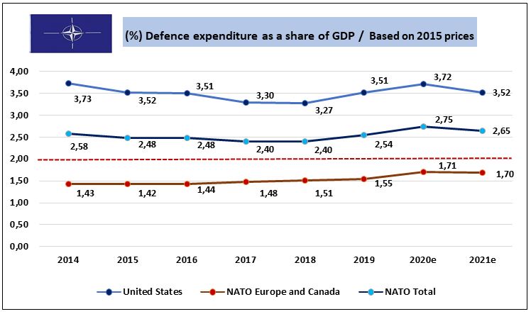 Estados Unidos muestran una tendencia a la baja, destacándose que en el año 2014 su gasto militar era el 3,73% de su PIB, y en 2021 solo alcanza el 3,52%. Los porcentajes de gasto de la OTAN Europa y Canadá, muestran una tendencia creciente respecto al nivel del 1,43%, de 2014, especialmente en los años 2020, y 2021, donde se alcanza, un 1,71% y un 1, 70% respectivamente. En ese periodo, su nivel de gasto en defensa permanece por debajo del 2% del PIB, comprometido en 2014.