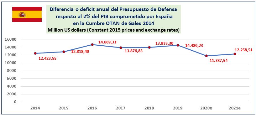 De igual modo, en el siguiente grafico se indica la evolución de la diferencia o déficit anual respecto a las cuantías que en teoría deberían haber alcanzado los Gasto de Defensa en España (2014-2021) si se hubieran consignado conforme a un 2% de su PIB (millones de dólares 2015)