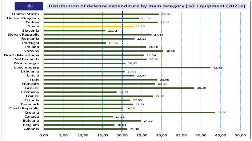 La estructura de los gastos de defensa se descompone en cuatro grandes grupos: Personal, Equipo (inversiones en grandes sistemas de armas), Infraestructura, y Operaciones, Mantenimiento e I&D; este último grupo, se suele referir por la OTAN, como “Otros”. Según lo acordado, los gastos relativos a Equipos, y como se ha dicho, los relacionado con la adquisición anual de equipamiento, deberían alcanzar anualmente, al menos el 20 % del total del gasto de defensa. España si cumple este objetivo.