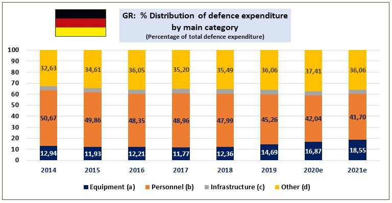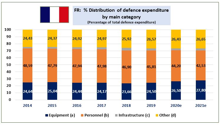 Francia en promedio 2014-2021, muestra que Personal son el 46,47% del total, las de inversiones en nuevos equipos y sistemas de armas el 25,09 %, las consignaciones para “otros” o cuantías dedicadas a operaciones, preparación de la fuerza, y R&D, el 25,53%.