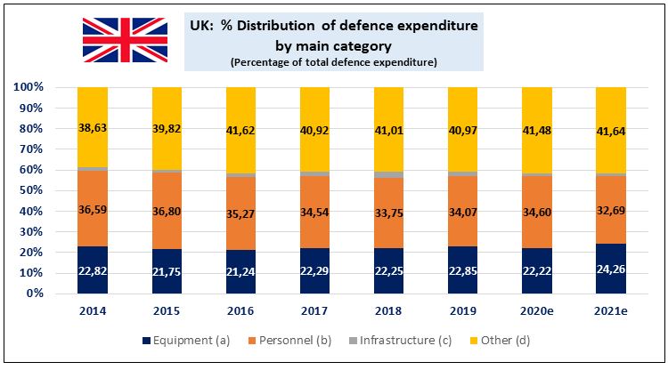 Reino Unido en promedio del periodo 2014-2021, las cuantías a Personal 34,79% del total, las de inversiones en nuevos equipos y sistemas de armas el 22,46 %, y las consignaciones para “Otros” (las cuantías dedicadas a operaciones, preparación de la fuerza, adiestramiento, y R&D), ronda el 40,76%.