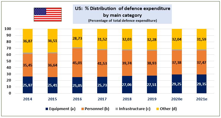 Para Estados Unidos, en promedio periodo 2014-2021, las cuantías a personal están al 39,02% del total, las de inversiones en nuevos equipos y sistemas de armas el 26,92 %, consignaciones para “otros gastos” o cuantías dedicadas a operaciones, preparación de la fuerza, adiestramiento, disponibilidad, y R&D el 36,69%..jpg)