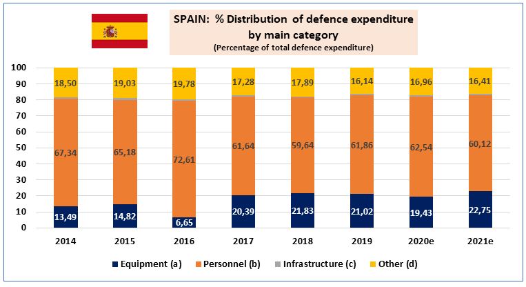 La distribución del gasto militar de España, como se ha podido observar, no está tan equilibrada como la de Reino Unido y Estados Unidos. Una explicación de esos desequilibrios comparativos, puede ser que, cuando los recursos necesarios están tan por debajo del 2% del PIB, el nivel de dotación de personal es un elemento, cuya reducción es difícil en el corto plazo, y más si se está ya en entornos de niveles críticos. Además, los condicionantes para su variación numérica, nivel de formación académica y preparación requiere de dilatados periodos de tiempo, y su dotación actual es posible que esté ya en limites inferiores mínimamente aceptables, respecto a lo que se pueda requerir para tener el tamaño adecuado de unas Fuerzas Armadas modernas y preparadas para que España afronte su actual realidad geopolítica. Los incrementos de gasto esperados del 2% del PIB, serían suficientes para realizar más inversiones en sistemas, R&D y aumentar los gastos dedicados al adiestramiento de la fuerza, lo que por sí mismos, ya introduciría equilibrios en la distribución del gasto, similares a mostrados por los países anteriormente señalados.
