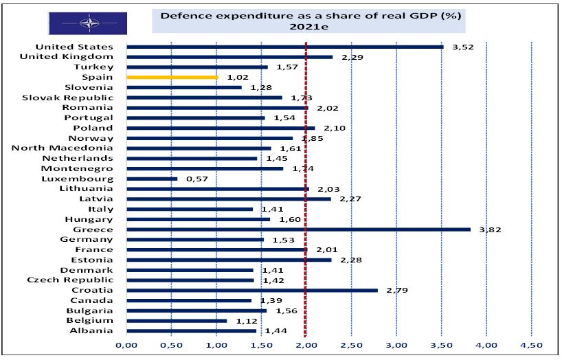 En general, el nivel del Gasto en Defensa de los países OTAN como porcentaje del PIB real (%) en el año 2021, solo ha sido alcanzado por 10 países, a pesar de ser una recomendación que se acordaba ya en el año 2009, y que como se ha dicho, cobra carta de compromiso tras la Cumbre de Gales de 2014, teniendo como objetivo el ser alcanzado por todos los países miembros, en el año 2024.