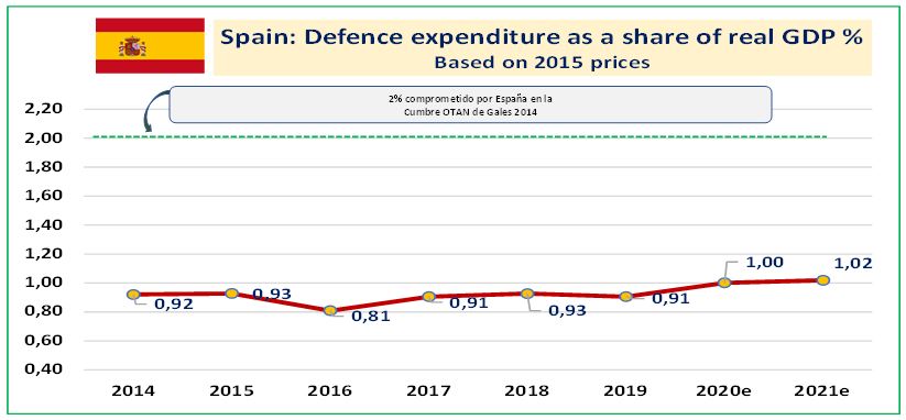 El gasto militar de España en 2021 se cifra en 12.749 millones de dólares, y en euros, unos 11.490 millones (1,02% PIB 2021) lo que suponen un incremento del 7,72 % respecto a 2010, e indica una voluntad política de iniciar una convergencia a la consecución de los compromisos asumidos y contribuir al reparto de la carga más en la línea con las responsabilidades de España actuales.