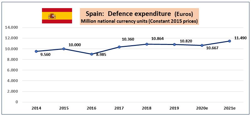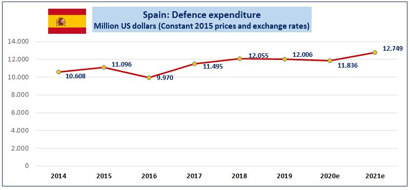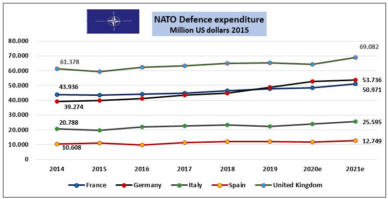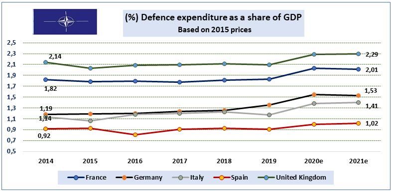 En el periodo de 2014 a 2021 España ha incrementado su gasto en defensa en un 20, 19%. Italia, ha realizado un incremento del 23,12% y Alemania, en el mismo periodo ha experimentado un incremento en su gasto militar del 36,82 %.