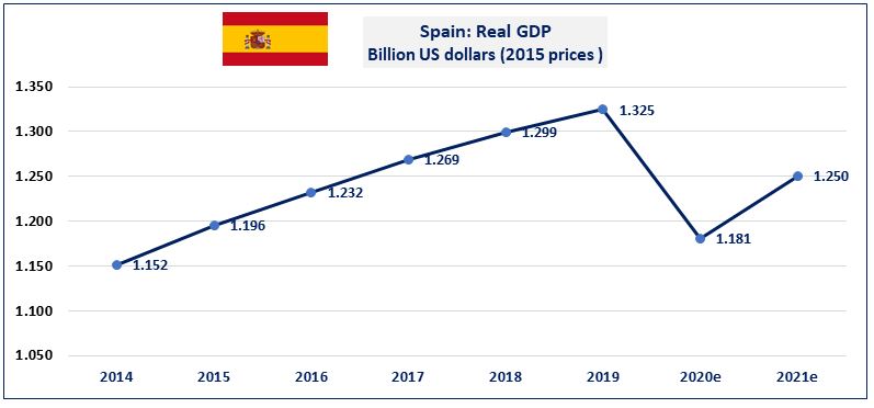 La Figura siguiente muestra la evolución del PIB de España en términos reales durante 2014 a 2021 (miles de millones de dólares de 2015)