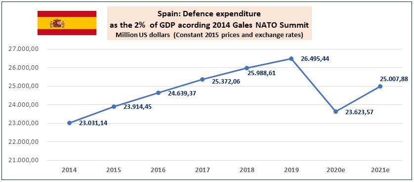 En la siguiente Figura se muestra la evolución de las cuantías que en teoría deberían haber alcanzado los Gastos de Defensa en España en el periodo 2014-2021 si se hubiera consignado el 2% de su PIB (millones de dólares 2015), en el año 2021, el nivel del gasto en defensa, de haberse realizado en base a la consecución del 2% de su PIB, habría tenido que ser de 25.007,28 millones de dólares.