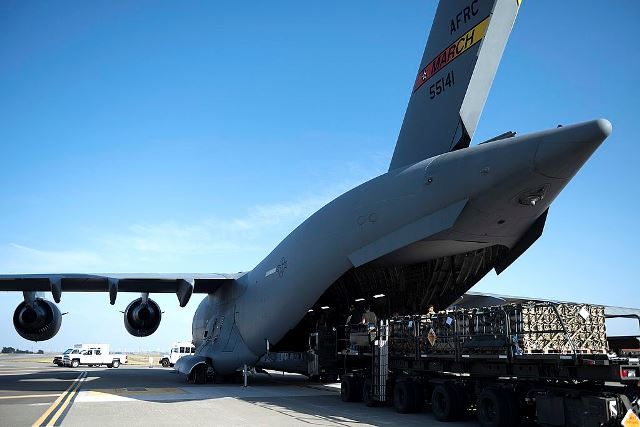 Un C-17 es cargado con munición con destino a Ucrania el pasado 25 de abril (Departamento de Defensa de Estados Unidos)