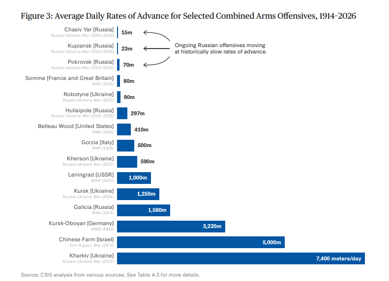 Media diaria de terreno conquistado al dia en pasados conflictos comparados con la Invasion de Ucrania . (Fuente CSIS)